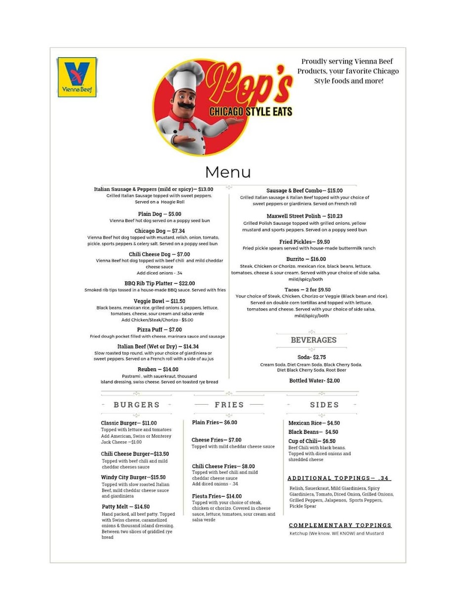 Pop's Chicago Style Eats Menu offers a delicious mix of classic comfort foods with a distinct Chicago twist, making it a must-visit spot for those craving hearty, flavorful meals. The fries selection is a standout, featuring crispy Plain Fries, indulgent Cheese Fries, and the crowd-pleasing Chili Cheese Fries. For something with a bit more flair, the Fiesta Fries are a fun option that adds a unique kick to the usual fry experience. Pair any of these with a refreshing beverage from their simple yet satisfying drink menu, which includes bottled water and sodas.